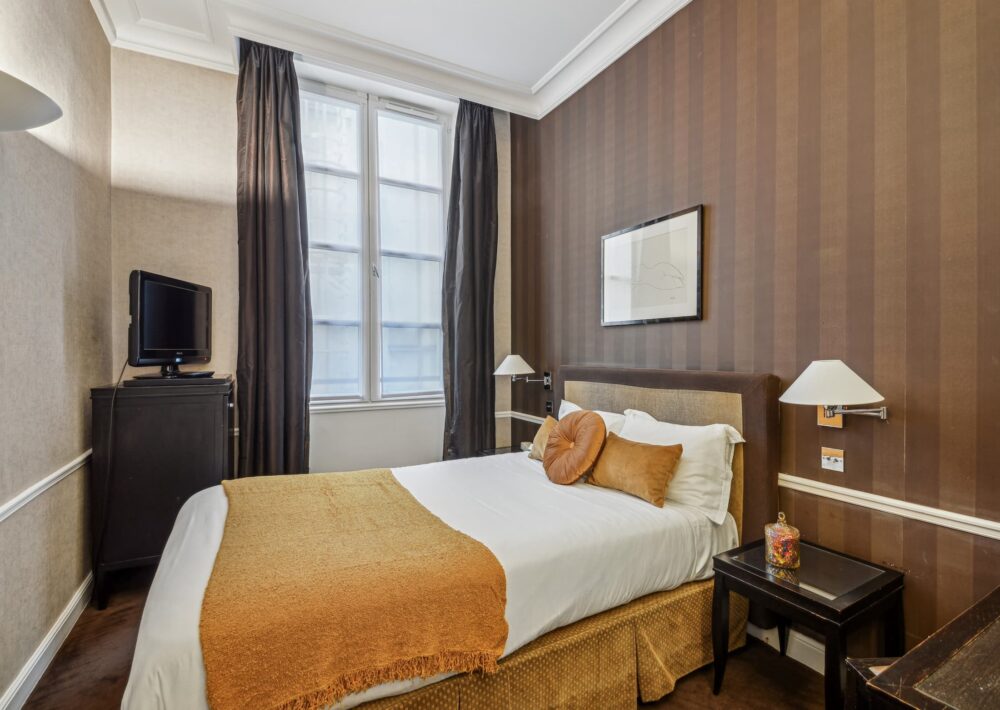 Notre chambre Classique est un véritable havre de paix, offrant une atmosphère paisible et sereine. Située sur cour, elle dispose d’une salle de bain raffinée en marbre. Équipée d’un lit double, d’une télévision, d’une machine Nespresso, ainsi que d’un mini-frigo et d’un plateau de courtoisie, elle garantit confort et bien-être. Nous avons sélectionné des produits Nuxe pour ajouter une touche de luxe et de qualité à votre séjour.