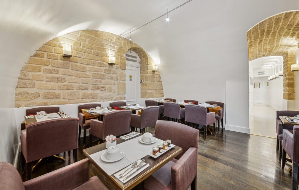 Chaque matin, de 7h à 10h30, profitez d’un généreux petit-déjeuner buffet dans notre salle voûtée, à l’ambiance intimiste et typiquement parisienne. Sous les pierres apparentes, l’atmosphère rappelle le charme discret des appartements de la capitale.